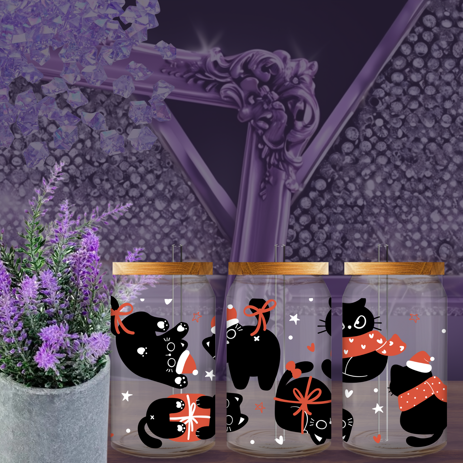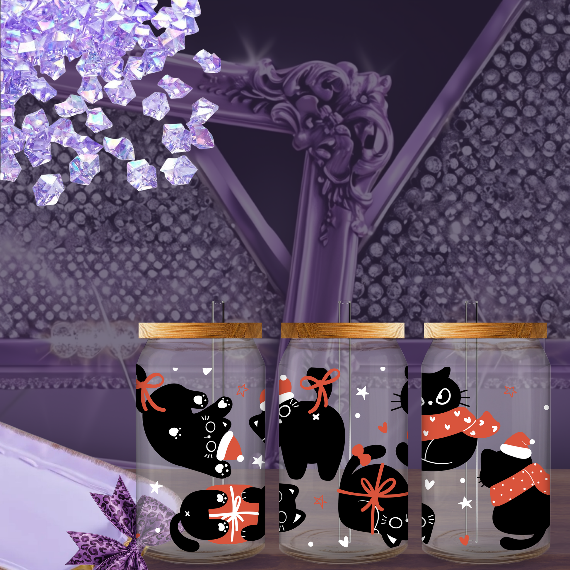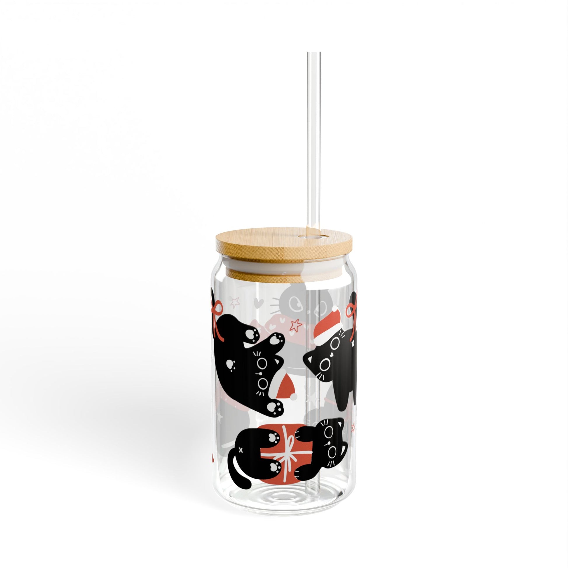 Paws-itively adorable! This 16oz Libbey glass can cup features festive black cats in Santa hats and cozy scarves — surrounded by bows, stars, and holiday cheer. It’s a must-have for cat lovers who want to sip their iced lattes with a side of seasonal cuteness 🐾🎄