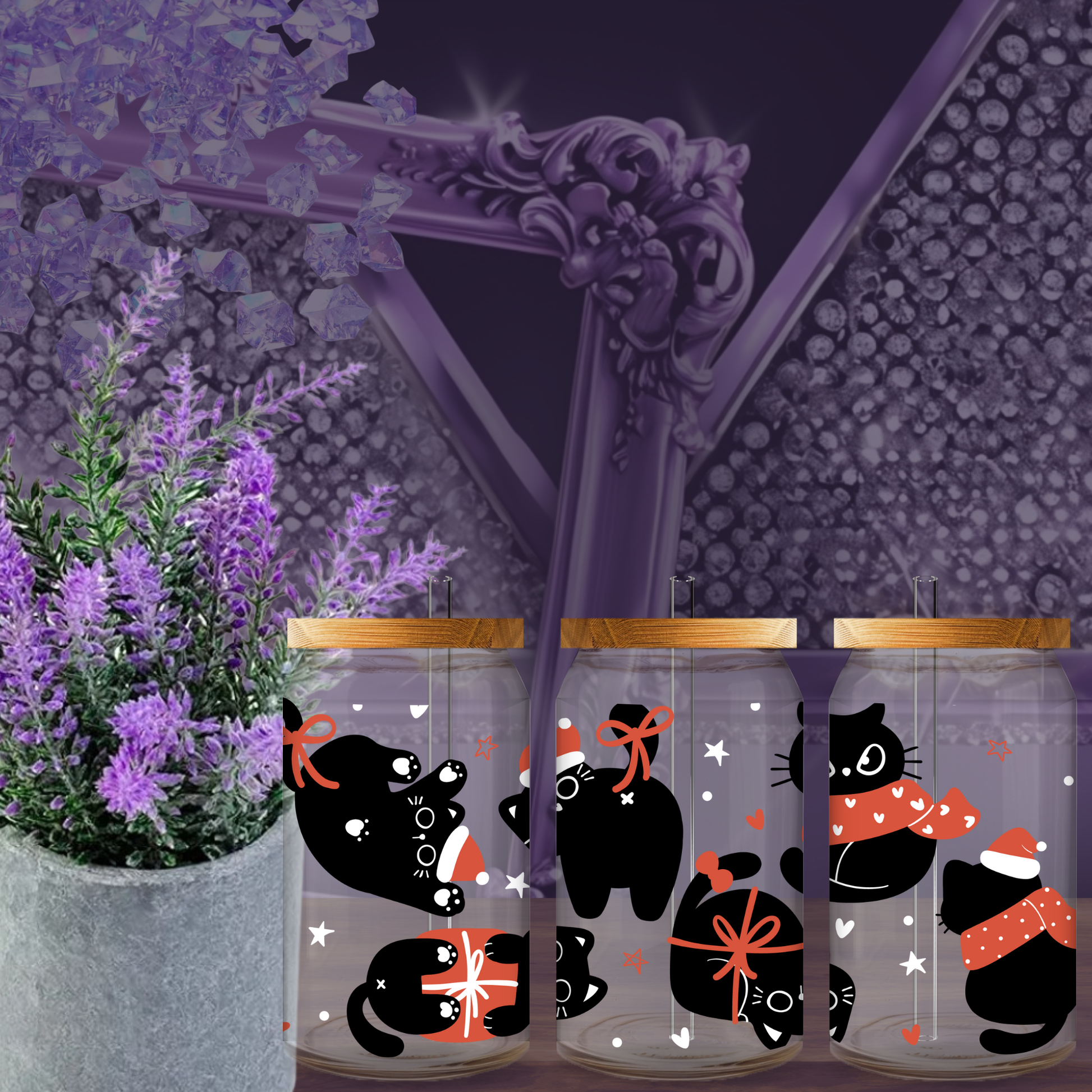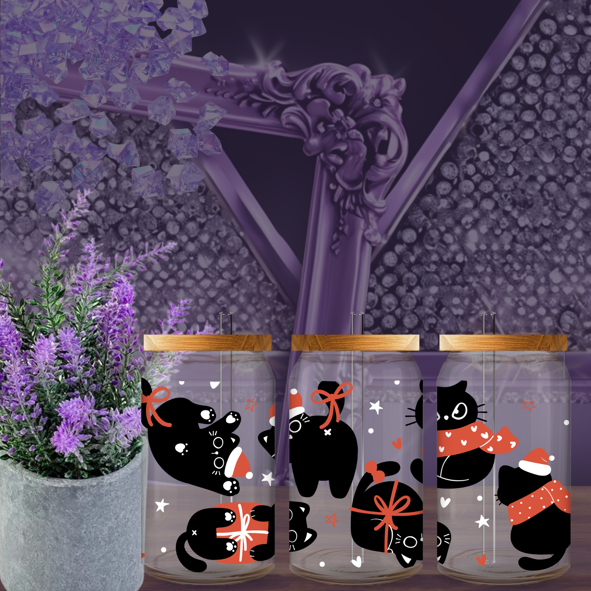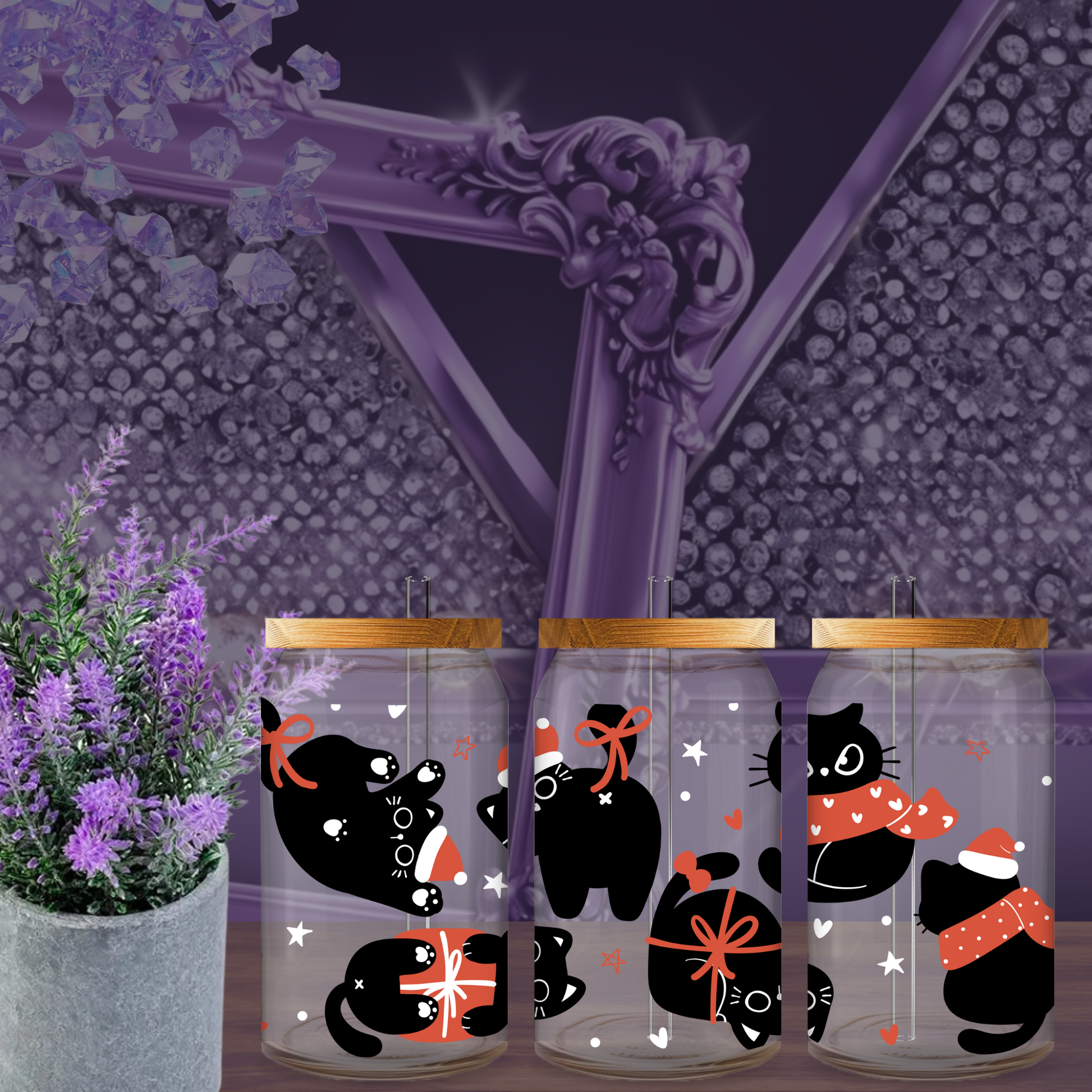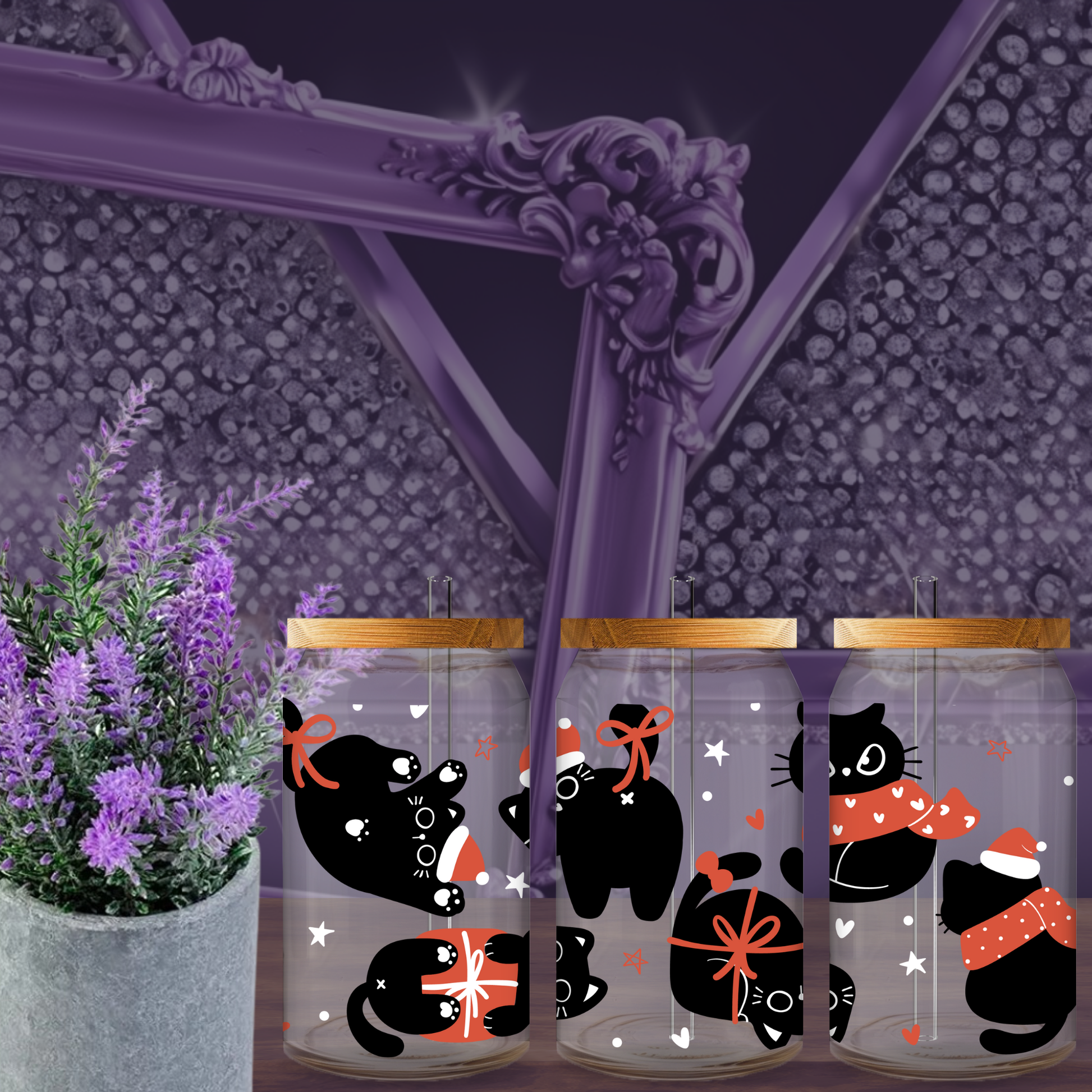 Paws-itively adorable! This 16oz Libbey glass can cup features festive black cats in Santa hats and cozy scarves — surrounded by bows, stars, and holiday cheer. It’s a must-have for cat lovers who want to sip their iced lattes with a side of seasonal cuteness 🐾🎄