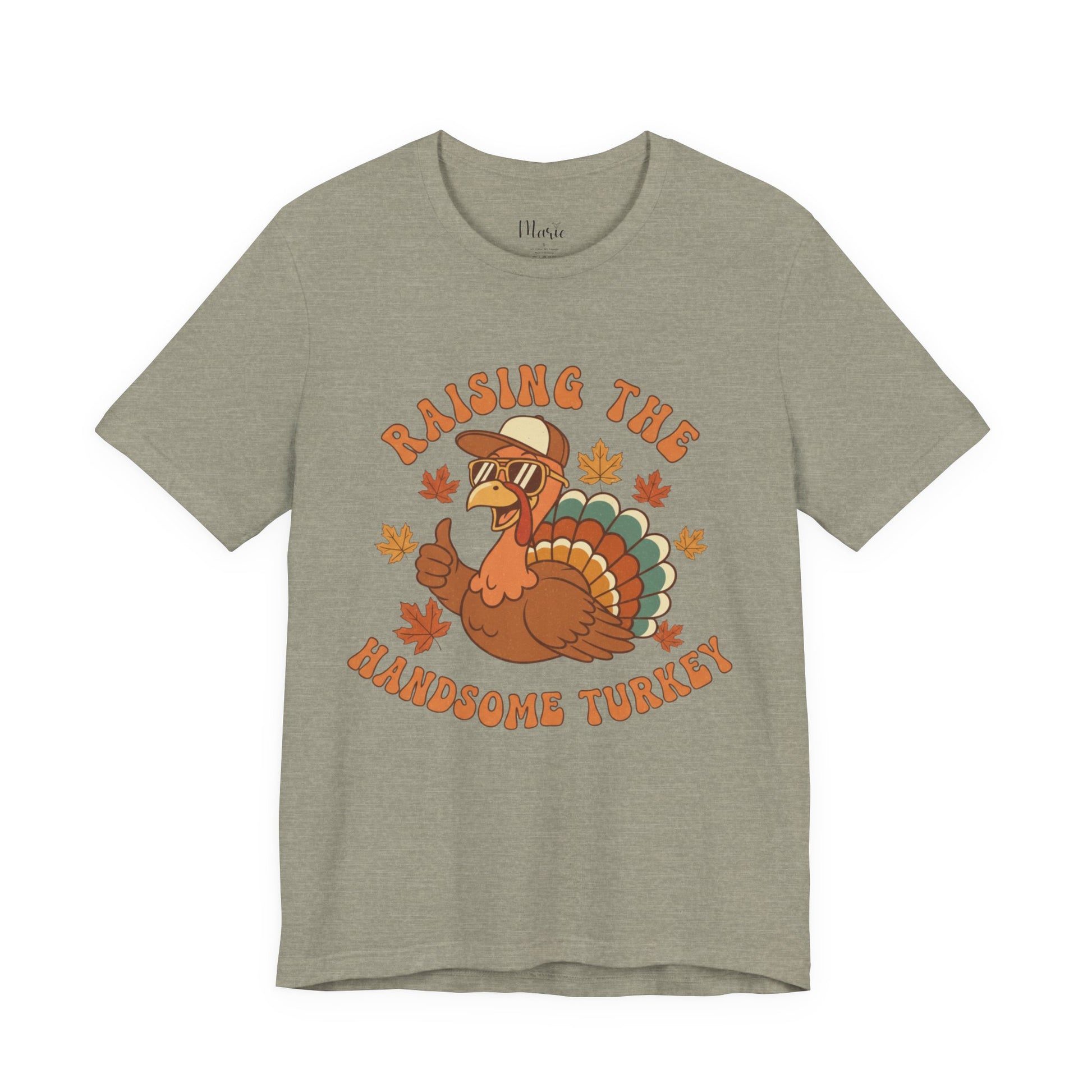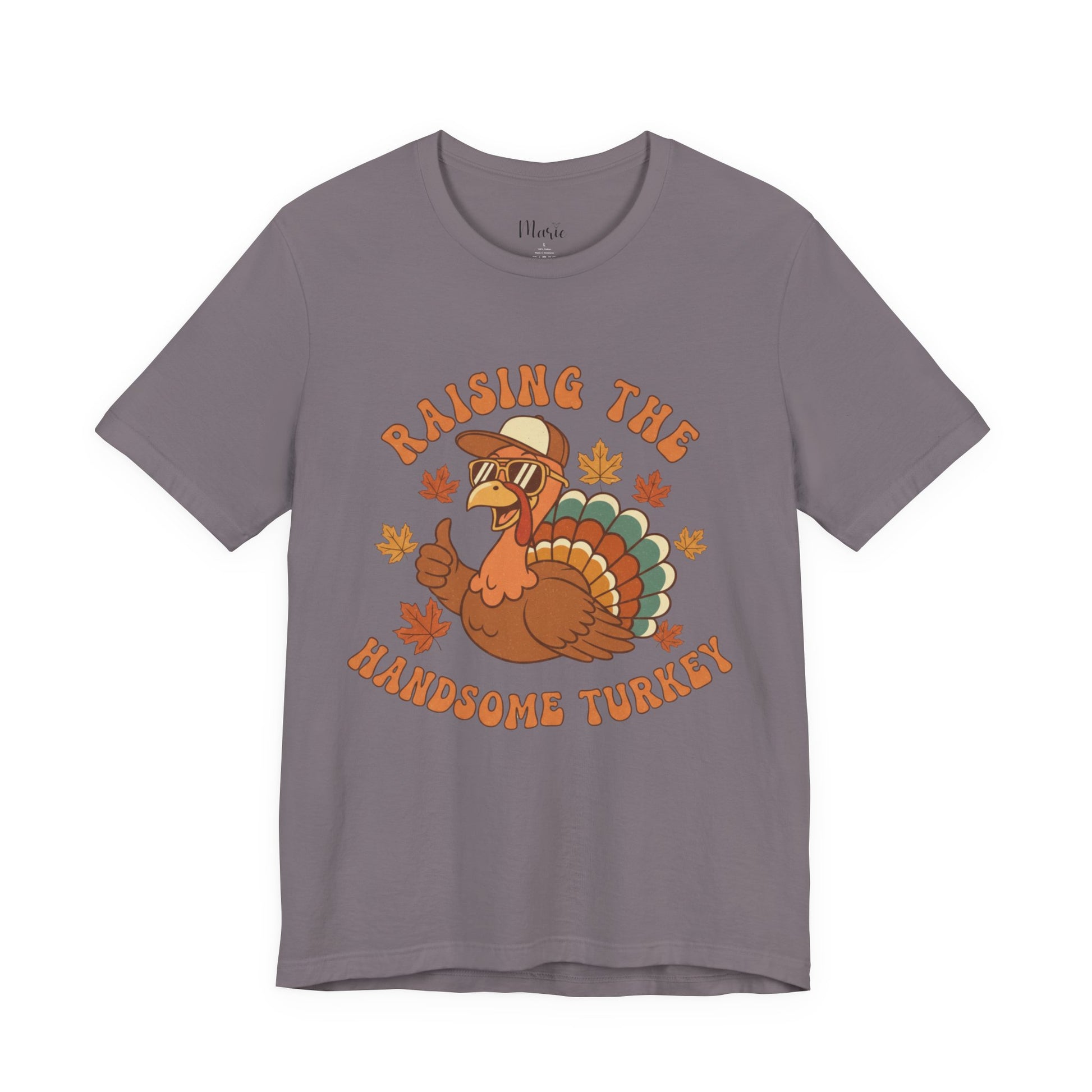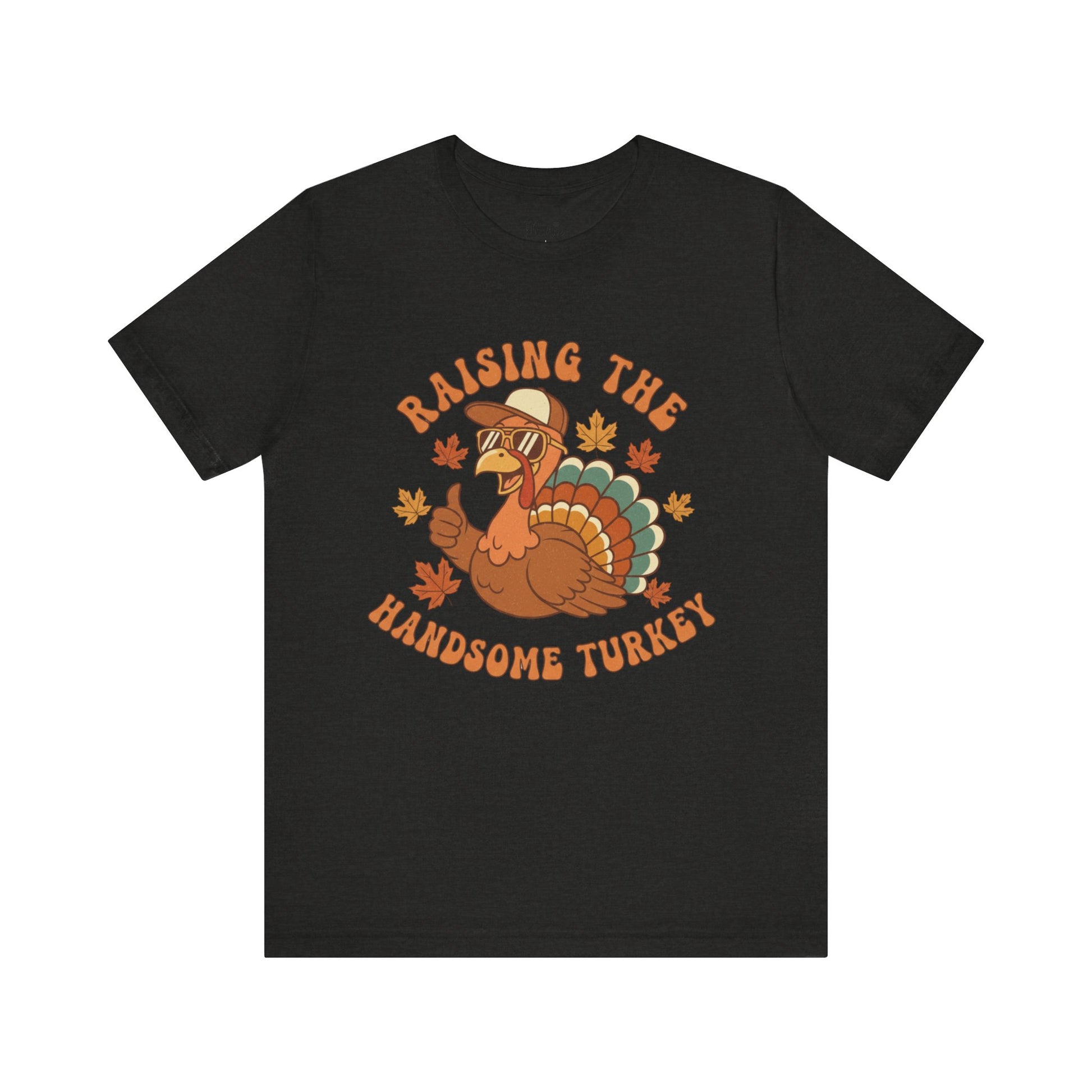 A unisex jersey short sleeve tee featuring a design of raising the handsome turkey. This lightweight and breathable shirt is perfect for casual and leisure wear, with a retail fit suitable for both casual and semi-formal settings. Ideal for adults, this shirt is made with high-quality materials by Bella+Canvas, ensuring comfort and style.