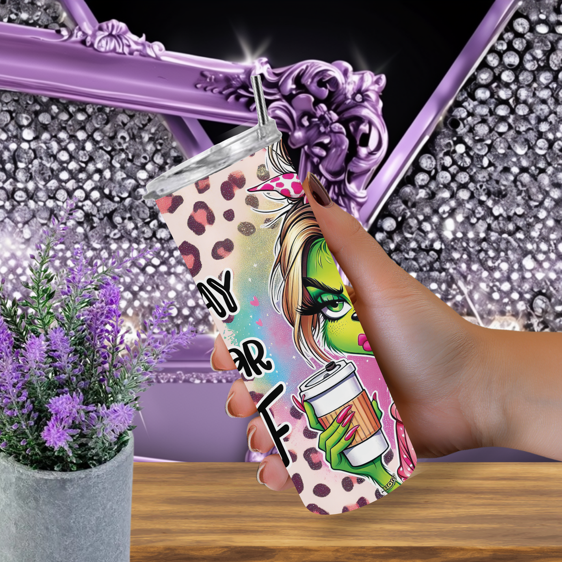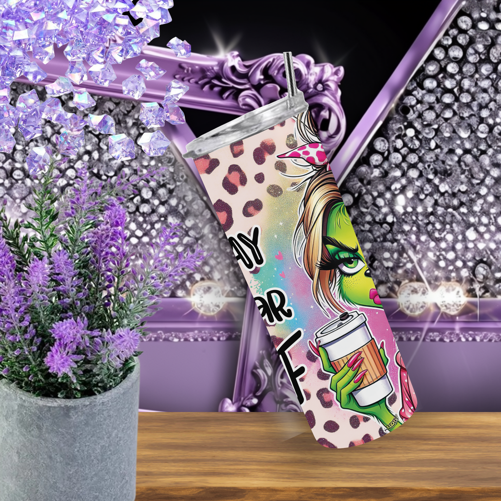 If you run on sarcasm and iced coffee, this tumbler is your new BFF. This 20 oz skinny tumbler features a sassy glam Grinch girl with a top knot, pink bow, and a steaming cup of caffeine — all set against a pink leopard print backdrop. Quote: “After Tuesday, even the calendar says WTF.” Enough said.