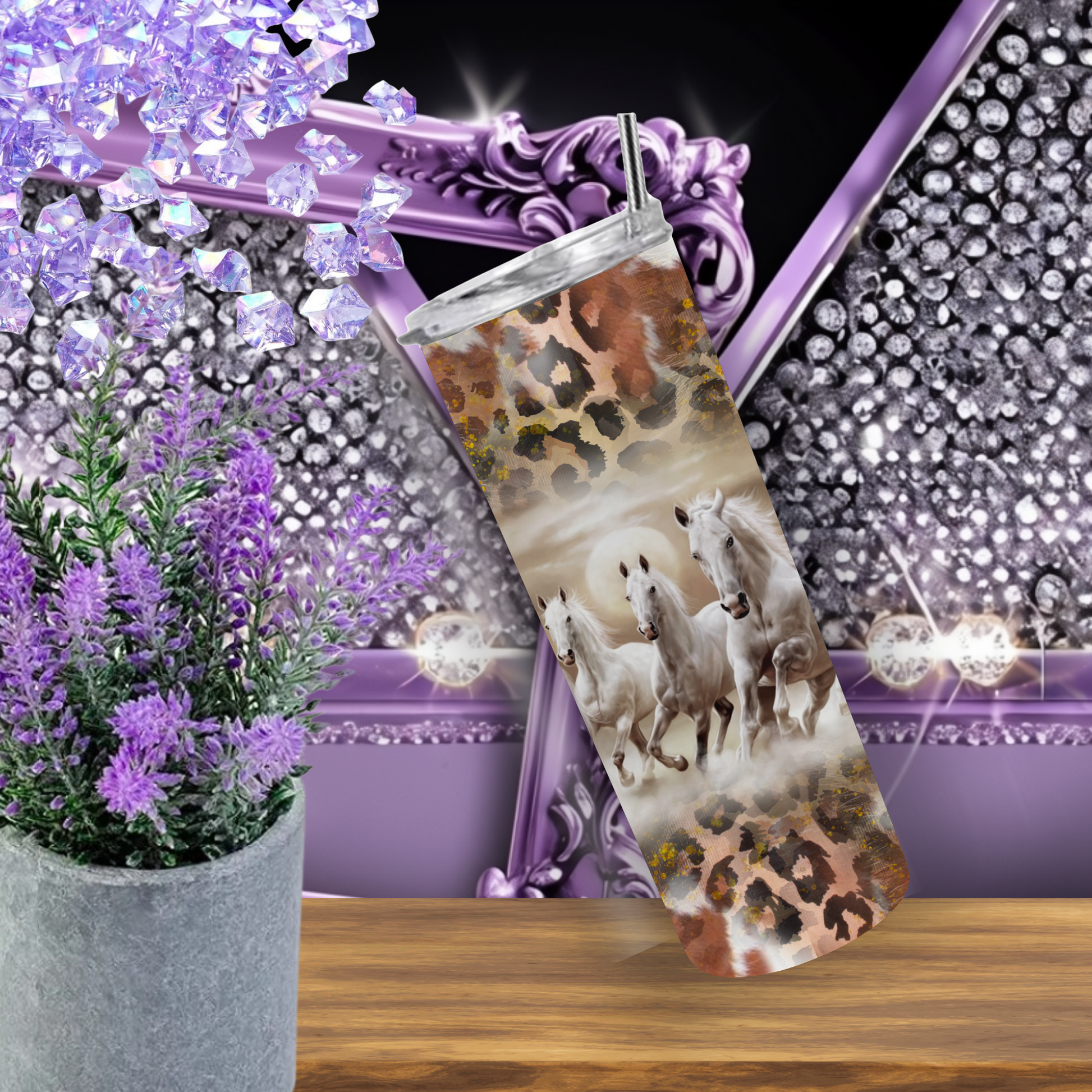 Bring bold cowgirl energy wherever you go with this 20 oz skinny tumbler featuring a powerful scene of white horses running across a desert backdrop — framed by a mix of cowhide texture, leopard print, and dusty Western glam. It's the perfect blend of wild, rustic, and totally fierce.
